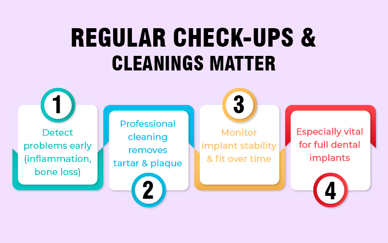 Patients who have undergone full Dental Implants need to have regular visits, timely and unforgettably, as multiple implants need to be taken care of.