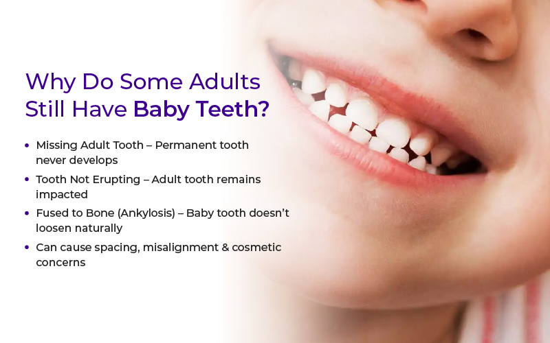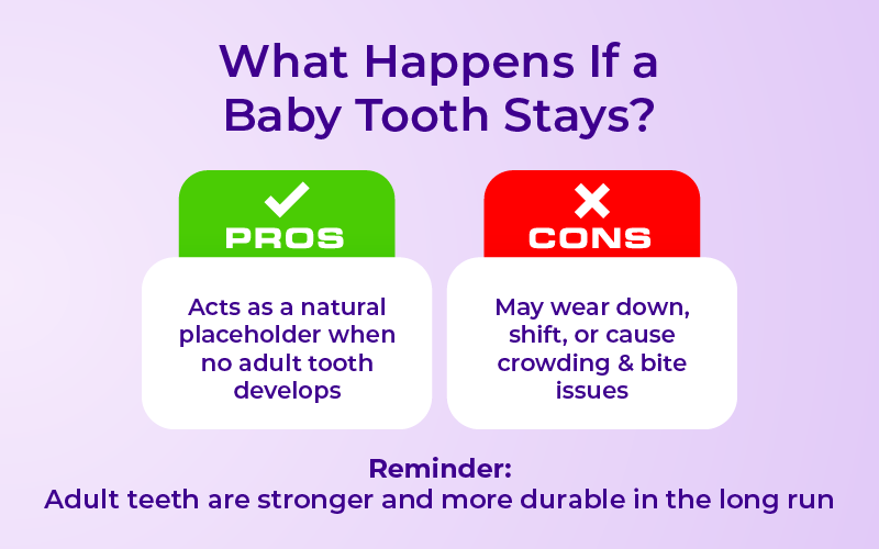 ❌ Missing Adult Tooth – In some cases, a permanent tooth simply never forms (a condition called congenitally missing teeth), which leaves the baby tooth in place longer than expected.